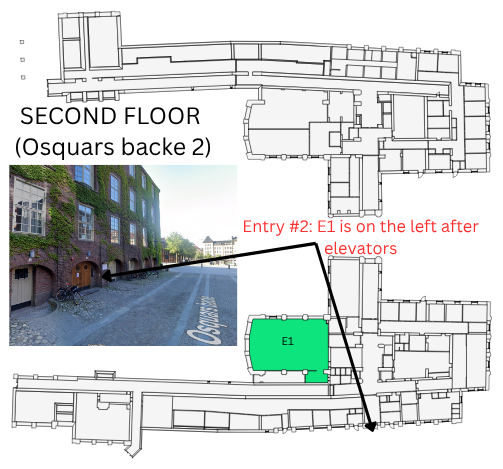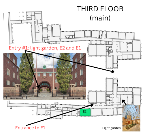 Lectures will be primarily held in E1, with E2 as a secondary (overflow) room (lecture will be streamed there). Coffee breaks and poster sessions will occur primarily on the third level (Light garden and surrounding rooms); we will also have coffee tables on the second floor (outside E1).